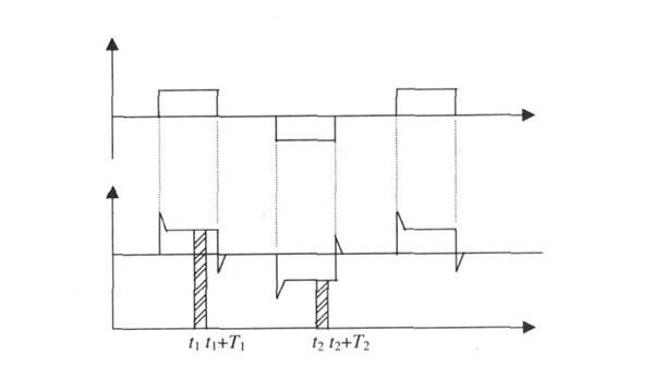 景觀給水流量計一般都采用工頻交流電源供電, 其電源電壓的幅值和頻率的變化都會給景觀給水流量計帶來電源性干擾噪聲。對電源電壓的幅值變化, 因采用多級集成穩壓, 一般而言電源電壓的幅值變化對電磁流量的測量精度影響不大。當電源電壓的頻率波動時, 雖然其波動范圍有限, 但對景觀給水流量計測量精度影響較大。為了解決工頻干擾問題, 實現對流體流速感應電勢eab信號的準確測量, 需利用以下基本關系:①勵磁周期為工頻周期的整數倍, 即勵磁頻率為50/nHz(n為偶數);②正負勵磁下的同相位采樣。圖2是對應低頻矩形波勵磁形式下的典型電勢信號形式, 按上述關系在一個勵磁周期下, 若假設t1 和t2 點為工頻干擾的等效干擾點, 且采樣寬度T=T1 =T2 , 則eab的基本算式為: