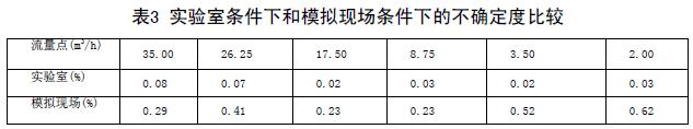 實驗室條件下和模擬現場條件下的不確定度比較(表3)兩次結果可以看出,兩次實驗各個流量點的不確定度差距非常大。可見,化工污水流量計對安裝條件還是比較苛刻的。