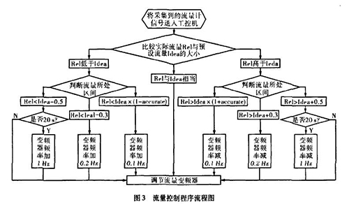 實(shí)際生產(chǎn)中流量一直在某個(gè)區(qū)域內(nèi)波動(dòng),且其動(dòng)態(tài)特性不易掌握。從上面的理論中我們能夠讓誤差△£盡可能的小,這樣距我們所需要的理論值%就越接近。而減小誤差需要我們把n取的盡可能大,也就是在生產(chǎn)時(shí)間內(nèi)劃分更多的周期去調(diào)節(jié)流量。當(dāng)工控機(jī)根據(jù)工業(yè)污水印染廢水流量計(jì)傳送回來(lái)的信號(hào)發(fā)出調(diào)節(jié)變頻器工作頻率的指令后,電機(jī)調(diào)整功率到工業(yè)污水印染廢水流量計(jì)的實(shí)際測(cè)量為一個(gè)工作周期,我們知道從指令發(fā)送到實(shí)際測(cè)量值返回有一個(gè)較大的滯后,如果調(diào)節(jié)的周期時(shí)間小于流量計(jì)本身的一個(gè)工作周期,那么顯然不可能達(dá)到減小誤差的目的。利用模糊控制思想H。,在控制程序中我們把流量的波動(dòng)區(qū)域劃分為±缸×Yo,Yo-t-O.3,Yo±0.5四個(gè)區(qū)域,其中缸為可調(diào)節(jié)的誤差范圍,生產(chǎn)中我們?nèi)?.015,流量區(qū)域劃分的單位均為t/h。針對(duì)不同的區(qū)域采取不同的調(diào)整方案。具體流程如圖3所示。圖中變量Rel表示實(shí)際測(cè)量的流量,變量Idea表示理論流量。