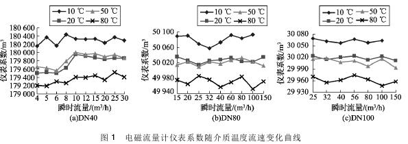 將實驗測得的農藥流量計在不同溫度及流速下的儀表系數數據整理,特性曲線如圖1所示,3組曲線分別對應DN40、DN80、DN100的3塊農藥流量計的儀表系數曲線。