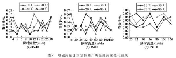 將實驗測得的農藥流量計在不同溫度及流速下的重復性數據整理,特性曲線如圖2所示,3組曲線分別對應DN40、DN80、DN100的3塊農藥流量計的重復性曲線。