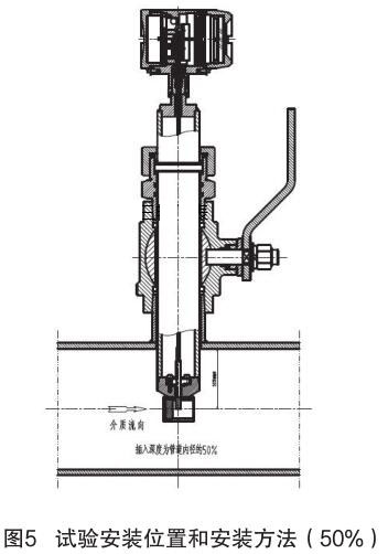 對插入式煙氣流量計和插入式電磁流量計的結構原理進行分析,插入式電磁流量計的信號采集點在標校管道內12.5% 為宜,因它屬電磁類流量計,而煙氣流量計是根據(jù)“卡門渦街”原理進行測量管道內流量,根據(jù)標校管道內層流和湍流的分析,以及插入式煙氣流量計獨特的探頭結構形式,確定插入式煙氣流量計的插入深度為標校管道內 50%,試驗安裝位置和安裝方法如圖 5 所示。