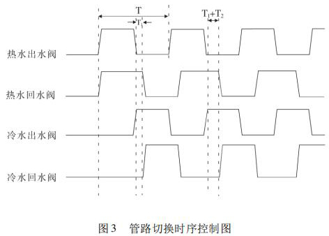 開始試驗(yàn),冷熱水箱預(yù)先達(dá)到試驗(yàn)要求溫度,水泵運(yùn)轉(zhuǎn)調(diào)節(jié)管路流量至設(shè)定值。系統(tǒng)給定信號控制四個開關(guān)閥(熱水出水閥、熱水回水閥、冷水出水閥、冷水回水閥) 的打開與關(guān)閉,實(shí)現(xiàn)冷熱水的切換。熱水沖擊時,熱水出水閥與熱水回水閥打開的同時,冷水出水閥與冷水回水閥關(guān)閉,確保試驗(yàn)管路熱水沖擊;同理,冷水沖擊時,冷水出水閥與冷水回水閥打開,熱水出水閥與熱水回水閥關(guān)閉,確保試驗(yàn)管路冷水沖擊。系統(tǒng)通過四個開關(guān)閥對管路進(jìn)行時序控制,達(dá)到管路切換的目的,很好地實(shí)現(xiàn)了 4000次冷熱循環(huán)沖擊試驗(yàn)。其具體的管路切換控制時序圖如圖 3 所示。