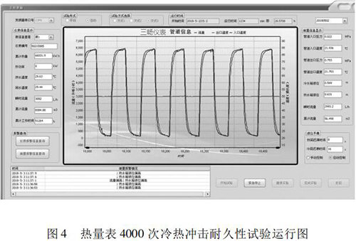 本文研究的 4000 次冷熱沖擊試驗(yàn)的實(shí)現(xiàn)具有以下特點(diǎn): (1)基于“工控機(jī) +水泵 + 化工污水流量計”的閉環(huán)控制系統(tǒng),實(shí)現(xiàn)了流量自動反饋調(diào)節(jié),滿足試驗(yàn)要求; (2)通過四個開關(guān)閥的時序切換,自動控制試驗(yàn)溫度,很好的完成了 4000 次溫度沖擊試驗(yàn); (3)通過“工控機(jī) + 數(shù)據(jù)數(shù)據(jù)采集卡”的數(shù)據(jù)采集系統(tǒng),實(shí)時監(jiān)控試驗(yàn)過程中的流量、溫度、壓力等相關(guān)參數(shù),實(shí)現(xiàn)試驗(yàn)方式的自動控制,并能對試驗(yàn)數(shù)據(jù)進(jìn)行分析與評定。 (4)試驗(yàn)的全過程為智能自動化,可無人員留守看護(hù)。試驗(yàn)結(jié)果可直接反映出熱量表在長時間運(yùn)行后的可靠性。為我國熱量表耐久性試驗(yàn)研究提供檢測手段,為促進(jìn)產(chǎn)品質(zhì)量提升做好技術(shù)保障。