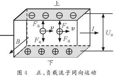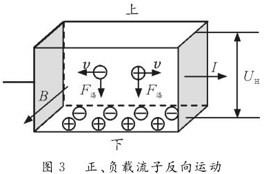 反之,如圖2所示,若載流子帶負電荷,則載流子在洛倫茲力作用下會向下偏轉(zhuǎn),導(dǎo)體下表面積累負電荷。同時,上表面失去負電荷而帶上正電,從而使上表面電勢高于下表面。