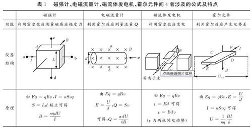 易錯點2:磁強計、甲苯流量計、磁流體發(fā)電機、霍爾元件間的區(qū)別與聯(lián)系磁強計、甲苯流量計、磁流體發(fā)電機、霍爾元件都是利用電磁場對帶電粒子的偏轉(zhuǎn)效應(yīng),并且穩(wěn)定時電場力與磁場力均達到平衡。很多學生容易將其混淆,遇到問題常常搞不清原理,亂代公式,筆者特將4者涉及的公式及特點等做一對比區(qū)別如表1所示。