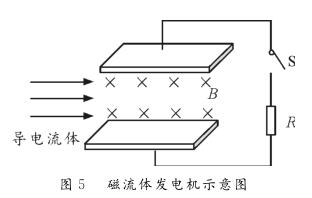 【例1】圖5為磁流體發(fā)電機示意圖。設(shè)兩金屬板間的距離為d,兩極板間勻強磁場的磁感應(yīng)強度為B。等離子體垂直進入磁場的速度為v,單個離子所帶的電荷量為q。離子通道(即兩極板內(nèi)所圍成的空間)的等效電阻為r,負載電阻為R。則下列判斷正確的是( )