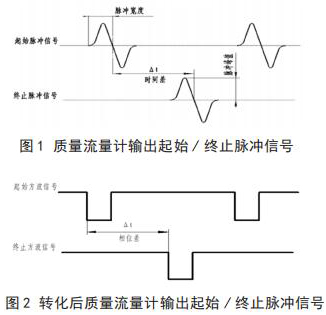 高壓電磁流量計流量與相關測試設備連接起來,就可以進行高壓電磁流量計的校準,時間差△ t 由專用試驗測試設備可以測出。起始脈沖信號和終止脈沖信號如圖 1 所示。經過專用試驗測試設備信號轉化后的信號方波如圖 2 所示。