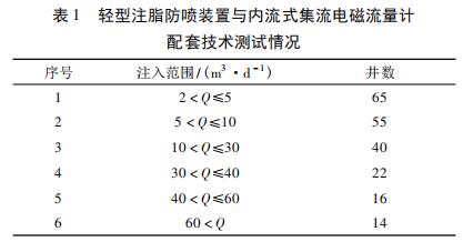 在實際應用中,使用輕型注脂防噴裝置與內流式集流智能型渦輪流量計配套技術對喇叭口在射孔層上注聚井進行測試。輕型注脂防噴裝置與內流式集流智能型渦輪流量計配套技術施工工藝參見文獻,測試情況見表 1 所示,低注入量井( ≤10 m3 /d) 占到 56. 60% 。